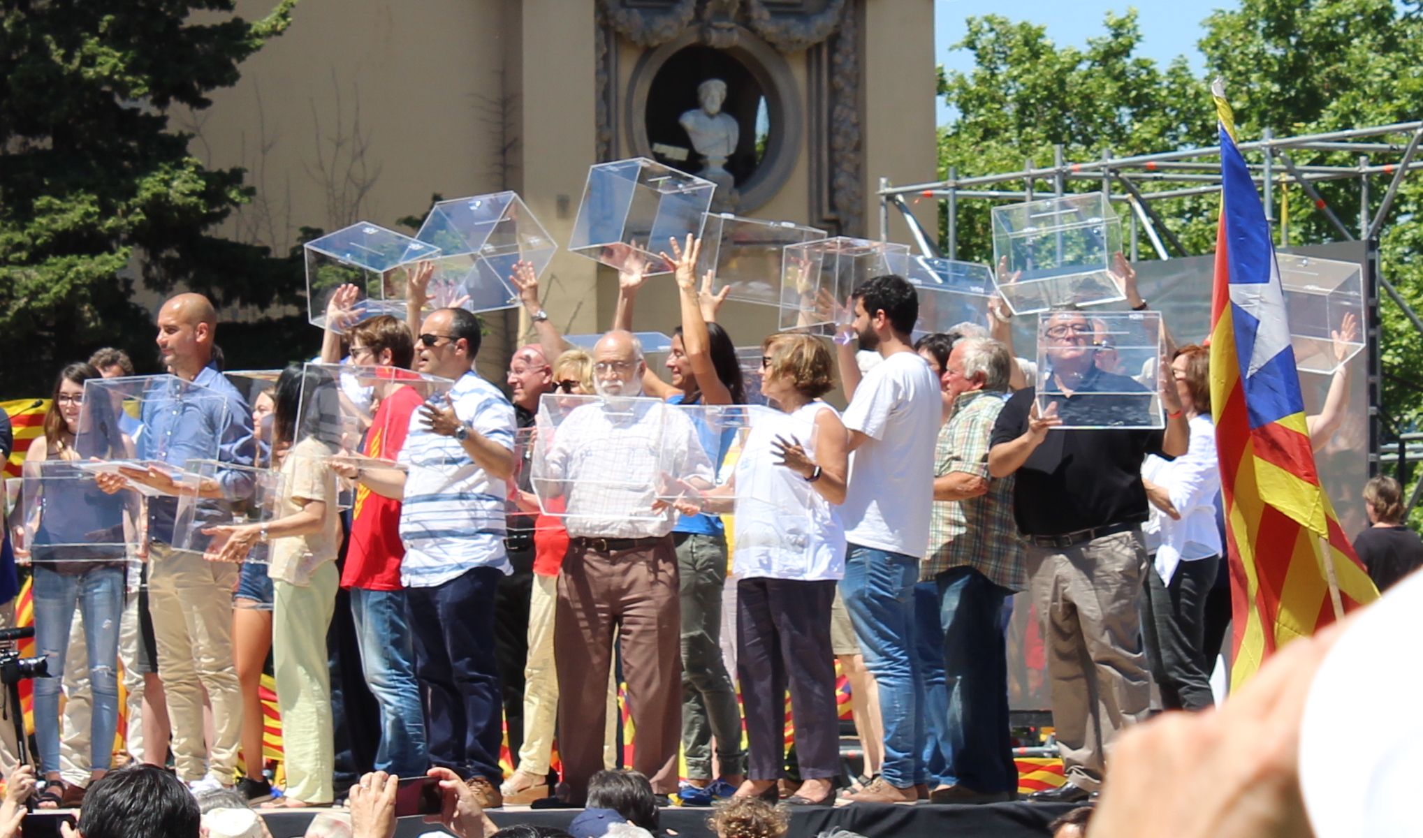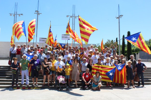 S’ha aixecat el dia sota un sol inclement, però hem omplert 3 autocars amb la gent de Sant Cugat per anar a la concentració “Referèndum és Democràcia” davant les 4 columnes de Puig i Cadafalch a Barcelona.
