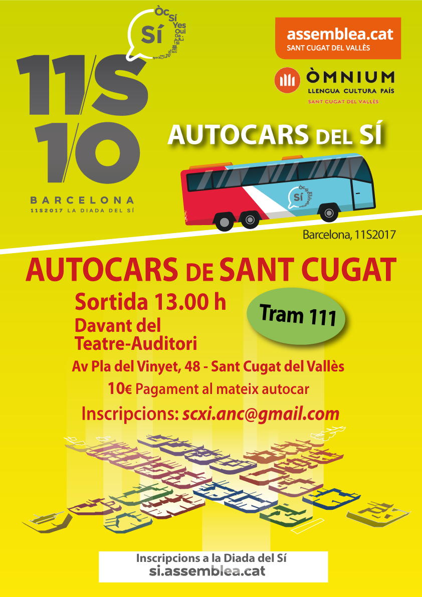 - Local de Sant Cugat per la Independència (C/ Cristòfor Colom, 24) tots els dimecres de 18:00 a 20:00. Us podrem informar també dels actes de la Diada i també podeu apuntar–os als autocars.