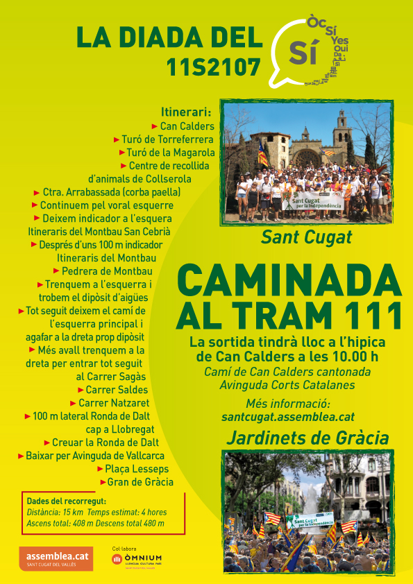 Un cop més des de Sant Cugat organitzem la caminada per anar a Barcelona per anar al tram 111 de la propera Diada del Sí de l’11 de setembre. En total seran 15 km i uns 400 metres de desnivell.