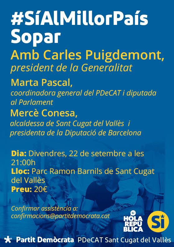 Sí al millor país! Sopar amb Carles Puigdemont demà divendres 22 a Sant Cugat