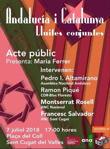 El dissabte 7 de juliol, a Sant Cugat del Vallès, és farà l’acte “Andalucía i Catalunya, lluites conjuntes” amb la presència, entre altres ponents, de Pedro Altamirano de l’Asamblea Nacional de Andalucía.L’acte començarà a les 17.00 a la plaça del Coll.