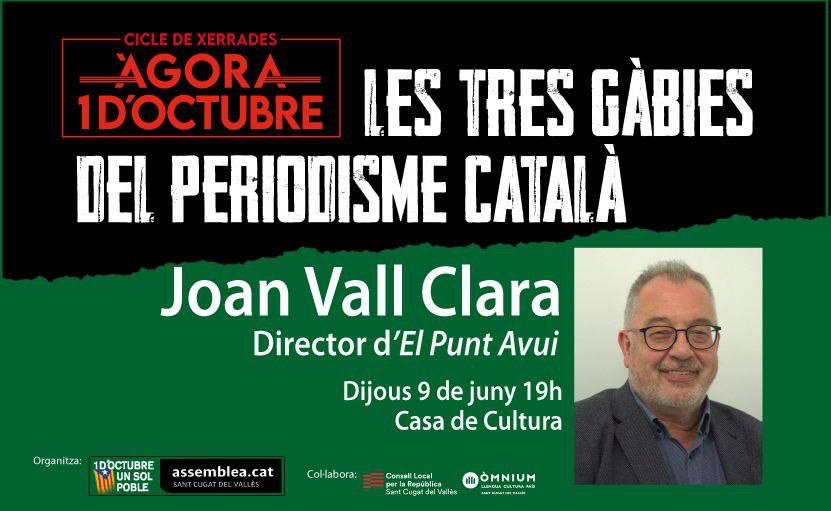 Us convidem aquest dijous 9 de juny a les 19 hores, a la Casa de Cultura de Sant Cugat, a la xerrada amb el director d’El Punt Avui, en Joan Vall Clara sobre “Les Tres Gàbies del Periodisme Català”.