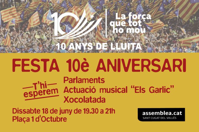 Aquest dissabte 18 de juny, esteu convidats a la Festa del 10è Aniversari de l’Assemblea, que tindrà lloc a la Plaça 1 d’Octubre, de Sant Cugat del Vallès, de 19:30 a 21:00 h.